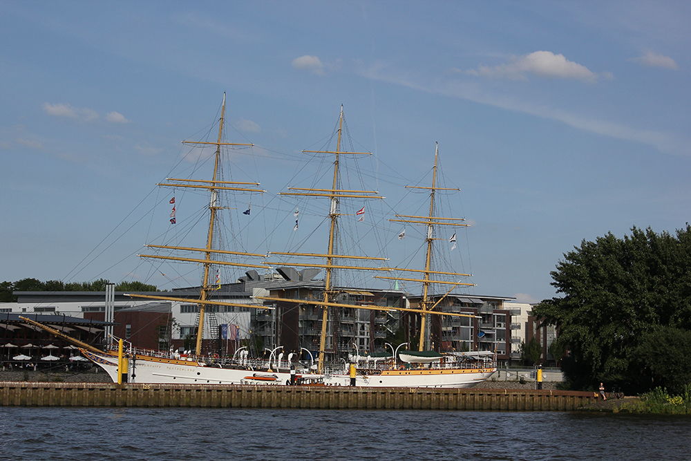 Erleben Sie einen Hauch von Seefahrtsromantik auf dem 1927 gebauten Großsegler. Gehen Sie auf Erkundungstour über die Decks, vorbei an den bis zu 52 Meter hohen Masten mit stehendem und laufendem Gut – wie die vielen, verwirrenden Stagen, Wanten, Padunen und Jolltaue, die Niederholer, Brassen und Tampen genannt werden – mit den vielen Blöcken und den Nagelbänken, durchs Offiziersdeck mit dem kleinen Bordmuseum, dem früheren Schiffshospital, dem Kapitänssalon in dem die standesamtlichen Trauungen durchgeführt werden, durchs Zwischendeck mit 30 Doppelkammern, in denen man heute übernachten kann, sowie der Messe und der Kajüte für kleine und grosse Feiern.