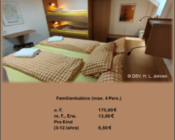 Inkl. Sekt und reichhaltigem Frühstück, aufgedeckt im Kapitänssalon. - Familienkammer mit 2 Kojen für die Kinder und eine Doppelkoje für Mama und Papa.
